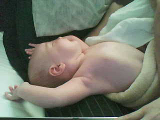 poor little collan got his first shots today. and he's taking it like a champ. he got quite upset when they were initially given, but he's just a smilin away now. he's thirteen pounds, one ounce. 22 and a half inches long, and healthy as can be. well, thats about it...